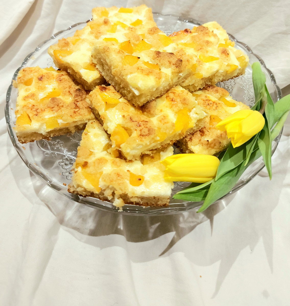 sokeri, vanilijasokeri, leivinjauhe, voi, vehnäjauho, maitorahka, kananmuna, kerma, persikka